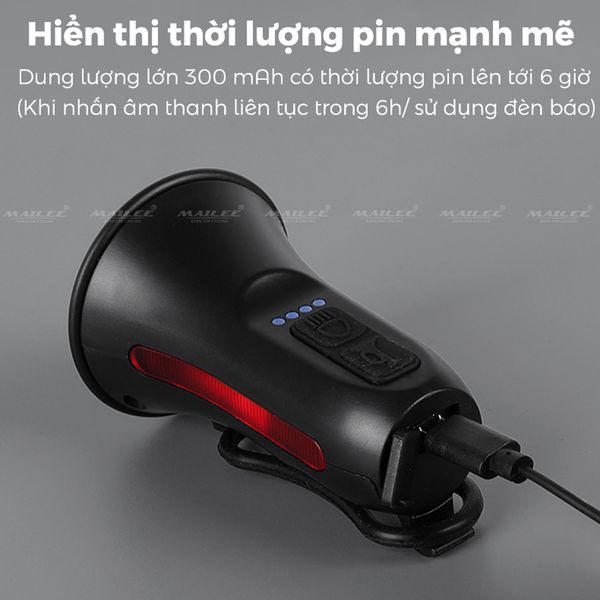 Dung lượng pin bên trong: 300 mAh, và có thể hoạt động lên đến 6 giờ sau khi sạc đầy (trong điều kiện sử dụng bấm còi liên tục và sử dụng đèn cảnh báo kết hợp).